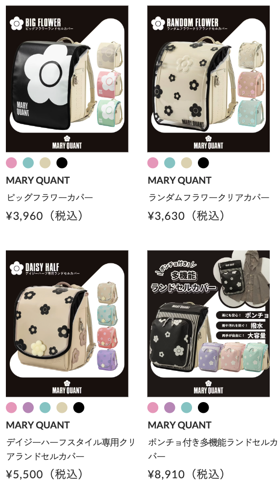 マリークヮントは、イギリス・ロンドン初のファッション・コスメティックブランド。既存のルールにとらわれず、直感を大切に、自由に発想し創造するという精神のもと、1950年代にはそれまでタブーとされていたミニスカートを発表し、”スウィンギングロンドン”というカルチャームーブメントを巻き起こしました。ありのままの自分を表現し、「自由に自分らしく」輝いて欲しいというメッセージを込めた、ファッショナブルでエッジの効いたランドセルをお届けします。