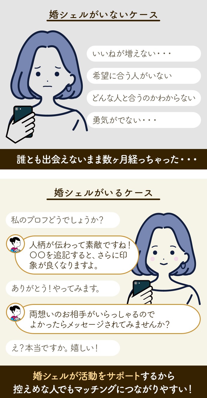 しかもこの相談サービス(婚シェル)は月額利用料に含まれているので、追加料金なく誰でも使うことができます。めちゃくちゃ心強いっ!