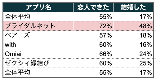 当サイトでアプリで恋活・婚活をしている1000人超へアンケートを行ったところ、ブライダルネットを利用していた人の7割が恋人ができたと回答。さらに結婚したと回答した人は48%。アプリ全体の結婚割合が約2割なので、倍以上も結婚した人が多く、成果が出ているアプリと言えます。