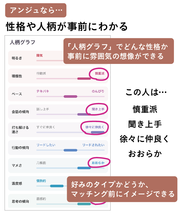 アンジュでは性格がグラフで見えるからこそ、その人の雰囲気も想像がつくので、写真や条件以外に、そもそもフィーリングが合いそうかも事前にしれます。