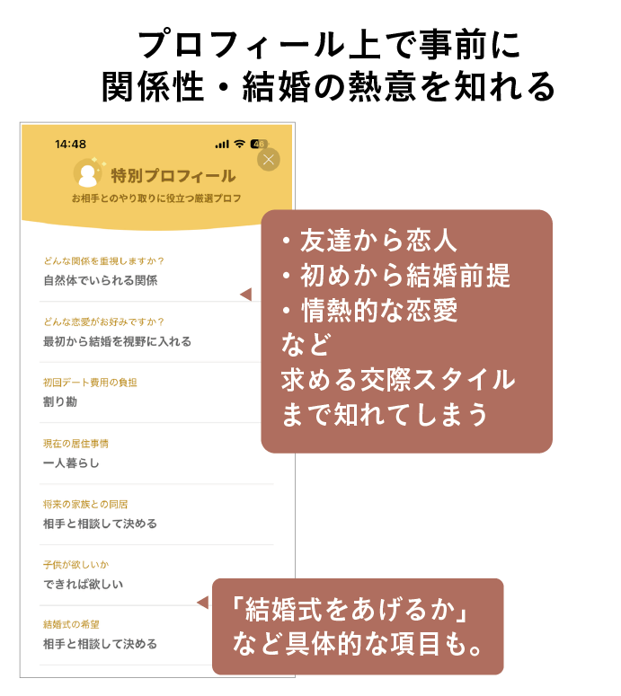 さらに、ここだけでなく、「特別プロフィール」の方では、どんな交際が良いか、結婚式は上げたいか、などかなり踏み込んだ質問にも回答できます。