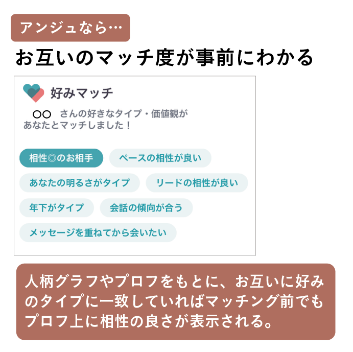 いろいろな角度から事前に相手のことを知れるため、マッチング後にうまく交流していける確率が高いのも、アンジュの良いポイントです。