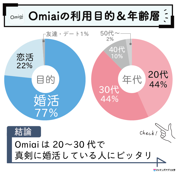 Omiaiの利用者を調査した結果、婚活目的で利用している人が77%、20〜30代の利用者が88%でした。