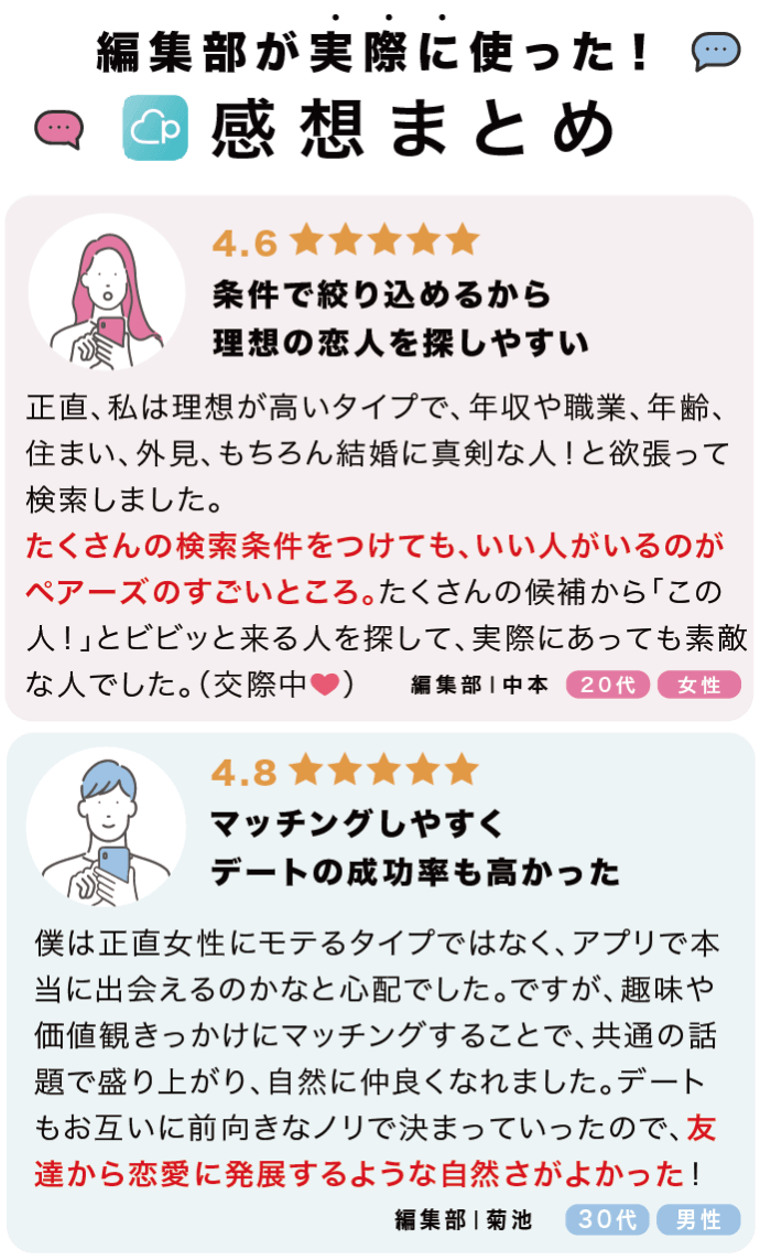 男女ともに恋愛に前向きで素敵な人が多いとの声も多く、20代~30代なら一番初めに使ってみてほしい婚活アプリ。