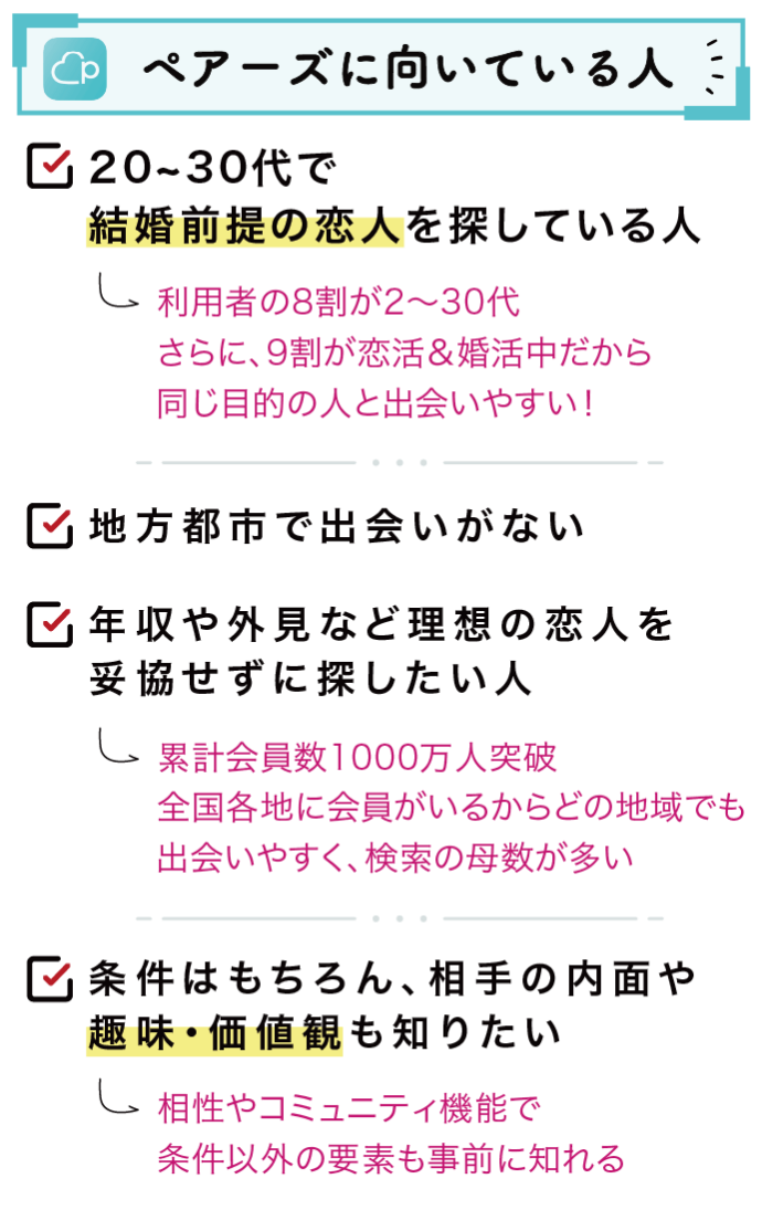 • 会員数の多さでいうなら「ペアーズ」