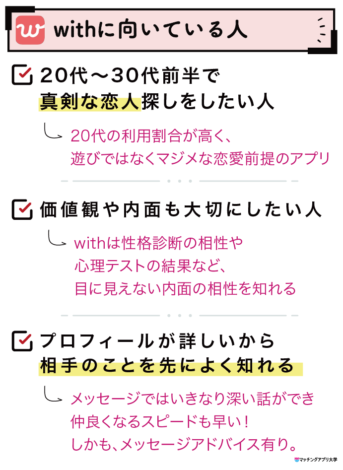 • withを選ぶ理由の多くが「ちゃんと付き合える恋人が欲しいから」