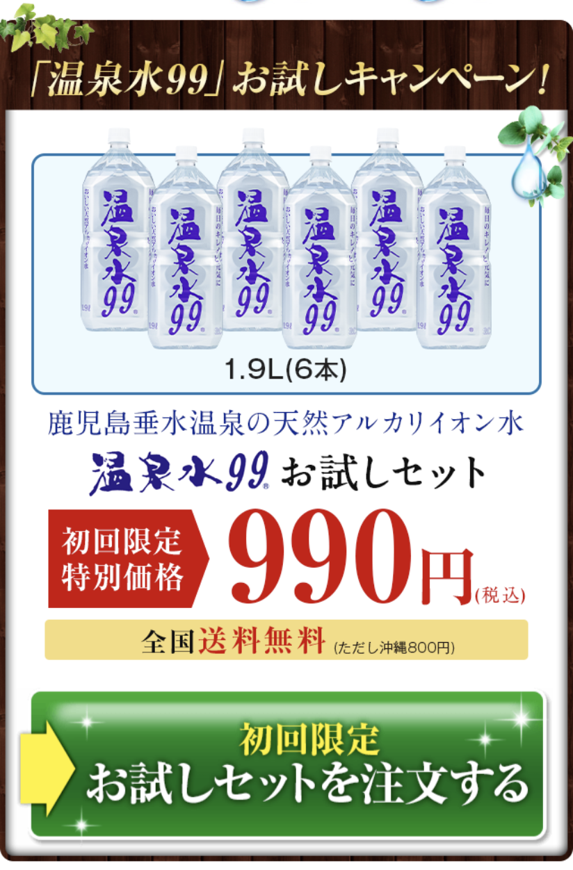 ※お試しセットのご購入は同一住所に1セットまでで温泉水99を初めてお買い上げの方のみの対象となります。