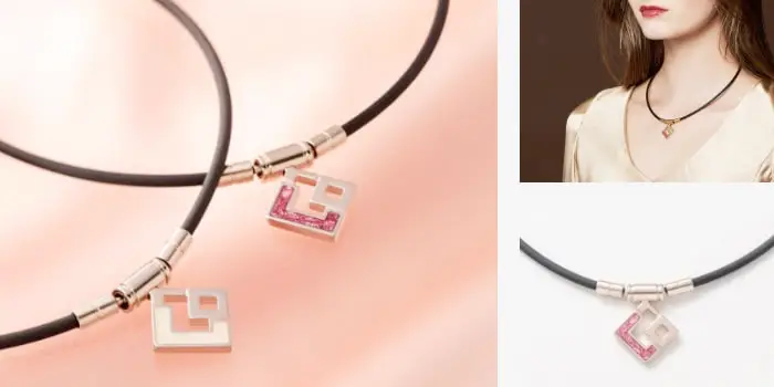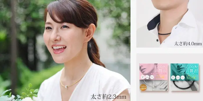 ファブリック調(径約2.3mm)/レザー調(径約4mm)の2タイプを展開。テクスチャー感のある上質なデザインの磁気ネックレスは、お洒落をしたいお出掛け時にも気兼ねなく使えて、いつでも肩こりケアができます。最大160mTの強力な磁石を全周に136個も配置し、磁気ネックレスとしての機能も定評があります。2.3mmの製品には取り外しができるペンダントが付属、またお手持ちのペンダントを合わせてもアクセサリーとして活用できます。