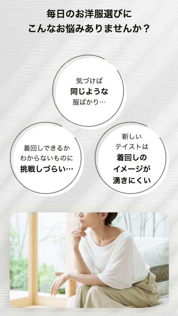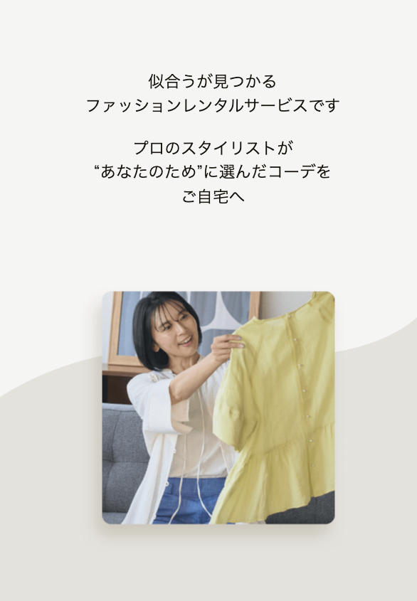 雑誌や広告などで活躍するプロのスタイリストがあなたのためにアイテムをセレクトします。50項目の質問から導き出されるスタイリングカルテをもとに、様々なジャンルから、あなた好みの、あなたに似合うスタイルを提案。着なくなったらすぐに返却できるので、クローゼットがいつでもスッキリです。