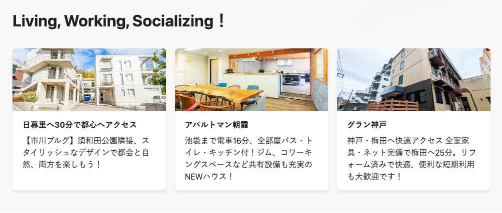 東京・関西圏を中心に展開する『外国人と暮らす』ことをコンセプトにした国際交流シェアハウス。入居者の国籍は日本人50%と外国人50%なので安心。サイトで入居者の国籍を見ることができるので、語学力アップのためにシェアハウスを選ぶ方はボーダーレスシェアハウスがオススメ!エリア:東京都, 大阪府, 京都府, 兵庫県