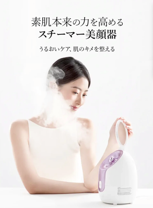 【微粒化技術/ワイド濃密スチーム】ナノは1mmの100万分の1の細かい粒子。ナノ微粒化技術:ナノは1mmの100万分の1の細かい粒子。普通のスチームと比べて格段にキメが細かいので肌への浸透力も高い!瞬時にナノ化された水分子がお肌の奥にまで届く、毛穴を開くことで詰まった角栓や汚れを落とし、洗浄効果を高め基礎化粧品の浸透率をアップさせてくれる美顔スチーマーです。